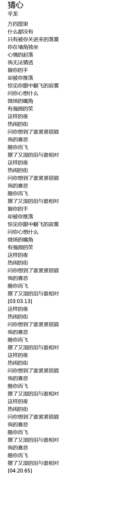 | [01:11.89] | wèn nǐ xīn xiǎng shén me |