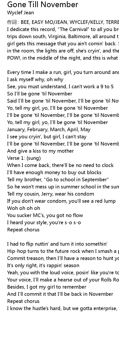 | Yo, tell my girl, yo, I' ll be gone ' til November | |