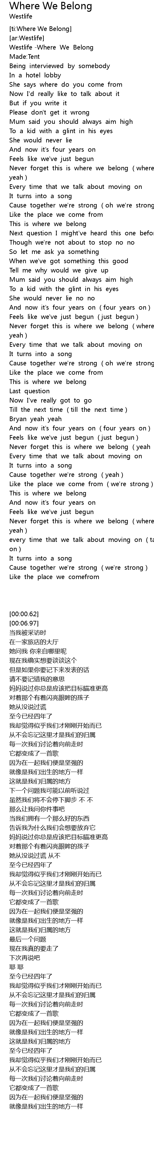 | [00:00.62] | Westlife Where We Belong |