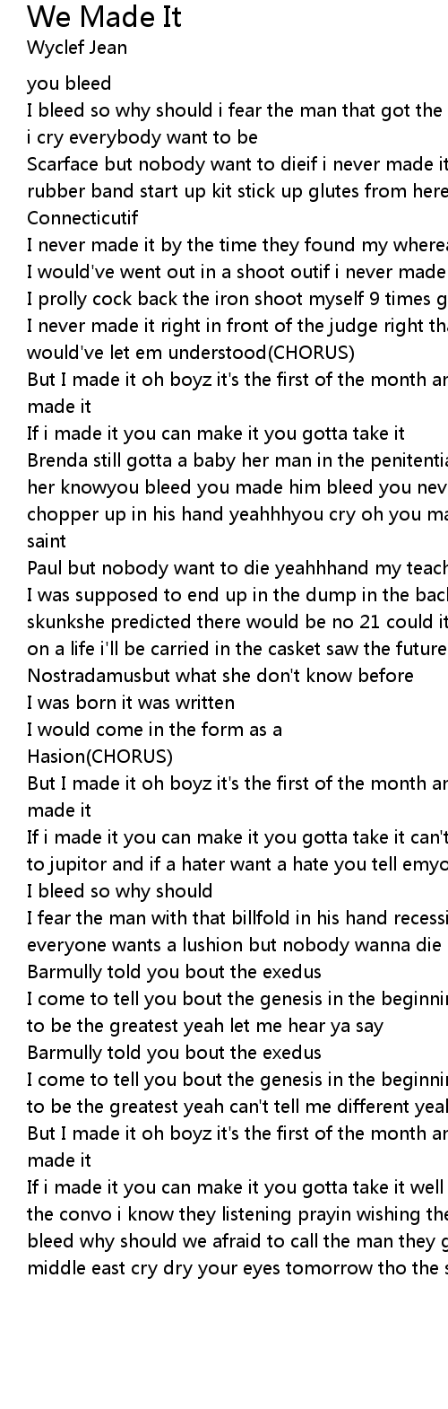 If i made it you can make it you gotta take it well we go ghetto somewhere in the convo i know they listening prayin wishing they childrendon't bleed cause we bleed why should we afraid to call the man they got the law up in them handsthe middle east cry dry your eyes tomorrow tho the sun will rise yeah |