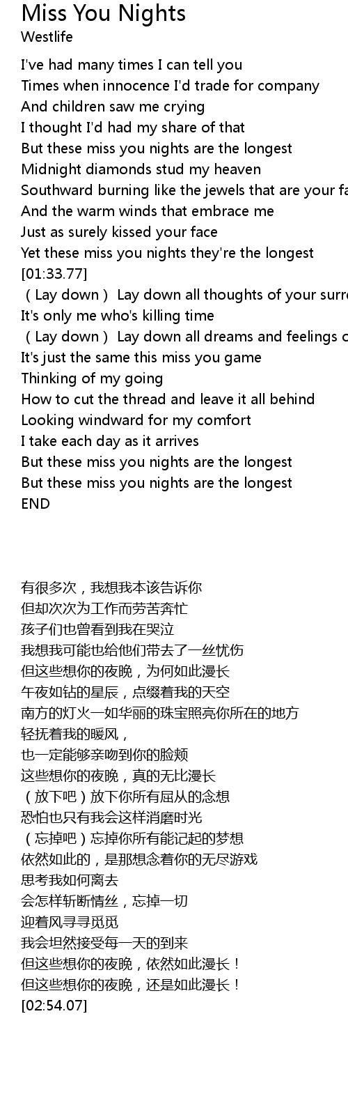 | [01:23.73] | Yet these miss you nights they' re the longest |