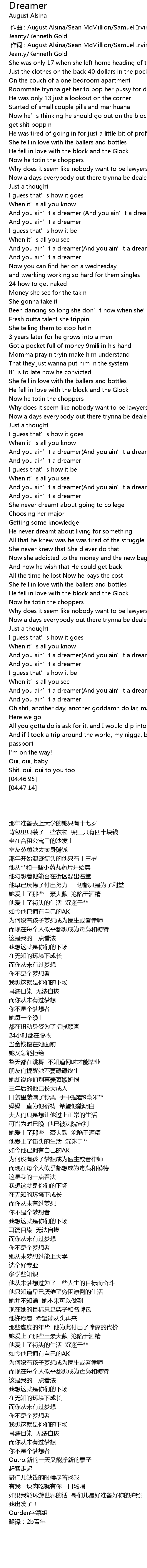 | [00:01.00] | zuo ci : August Alsina Sean McMillion Samuel Irving III Ralph Jeanty Kenneth Gold |