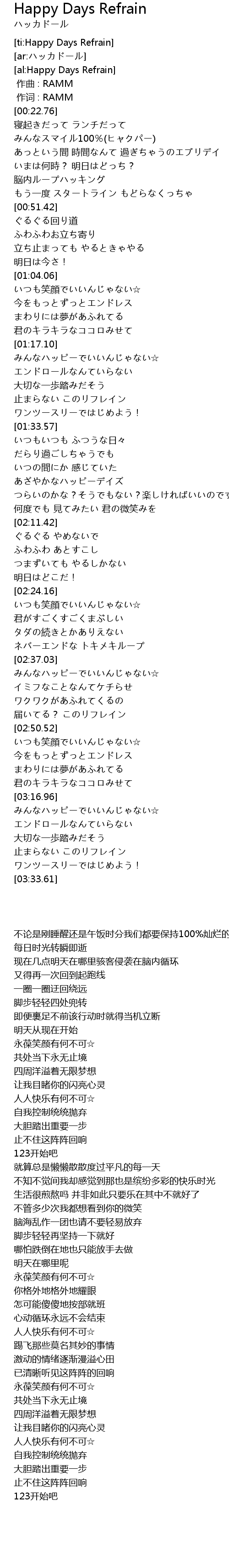 | [01:52.63] | いつの間にか 感じていた あざやかなハッピーデイズ |