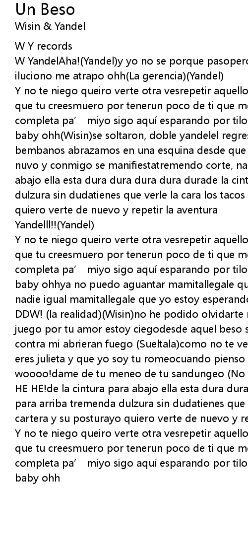 | Y no te niego queiro verte otra vesrepetir aquellos días de lujuria y fantasias que tu creesmuero por tenerun poco de ti que me digas que situ nasiste pa’ mi completa pa’ miyo sigo aquí esparando por tiloco de besarte tocarte mimarte baby ohh(Wisin)se soltaron, doble yandelel regreso 321me dio un besito en la bembanos abrazamos en una esquina desde que empezo la fiestacuatro botellas de nuvo y conmigo se manifiestatremendo corte, nada le molestade la cintura para abajo ella esta dura dura dura dura durade la cintura para arriba tremenda dulzura sin dudatienes que verle la cara los tacos la cartera y su posturayo quiero verte de nuevo y repetir la aventura | |