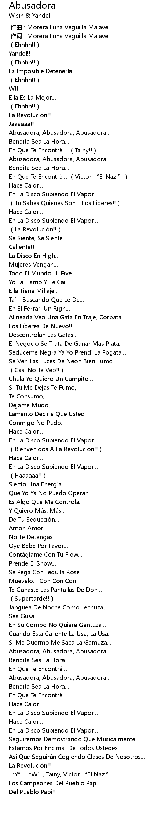 | [01:57.46] | Abusadora, Abusadora, Abusadora… |