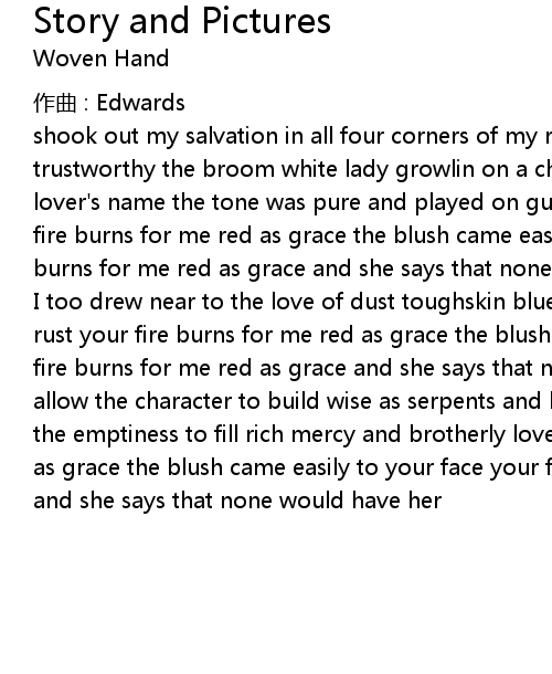 | shook out my salvation in all four corners of my room lowly is the dust trustworthy the broom white lady growlin on a chain peacock caw the sound of my lover' s name the tone was pure and played on gut from your birdhouse aflame your fire burns for me red as grace the blush came easily to your face your fire burns for me red as grace and she says that none would have her as a boy | |