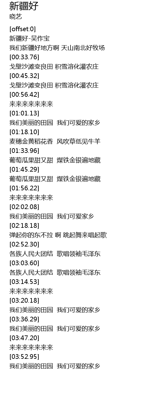| [00:26.71] | 我们新疆好地方啊 天山南北好牧场 |