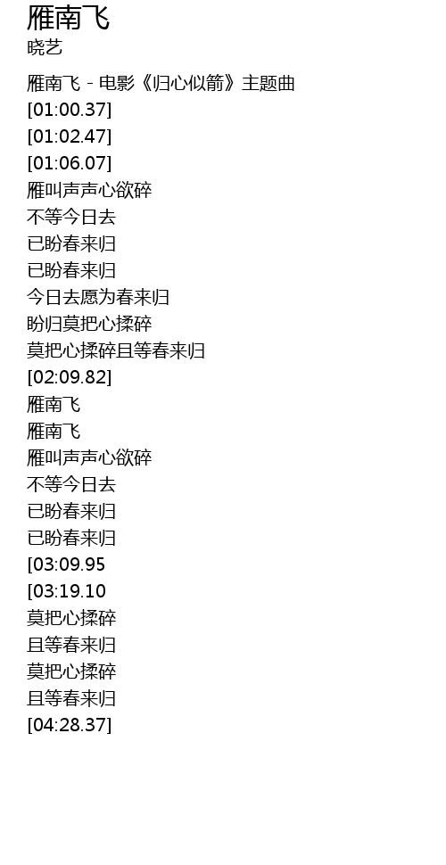 | [00:30.00] | 雁南飞 - 电影《归心似箭》主题曲 |