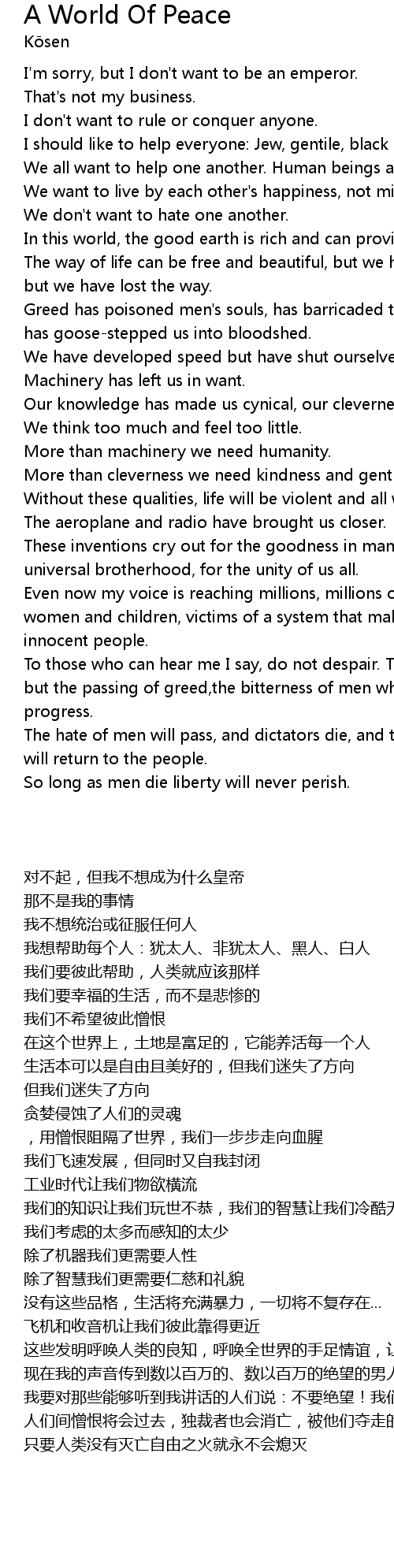 To those who can hear me I say, do not despair. The misery upon us is but the passing of greed,the bitterness of men who fear the way of human progress. |