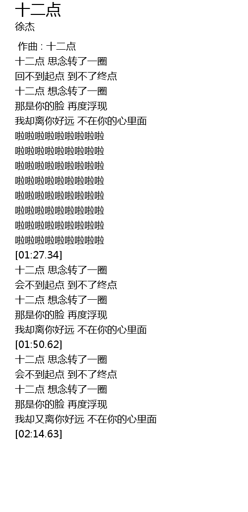 | [01:36.64] | shí èr diǎn xiǎng niàn zhuǎn le yī quān |