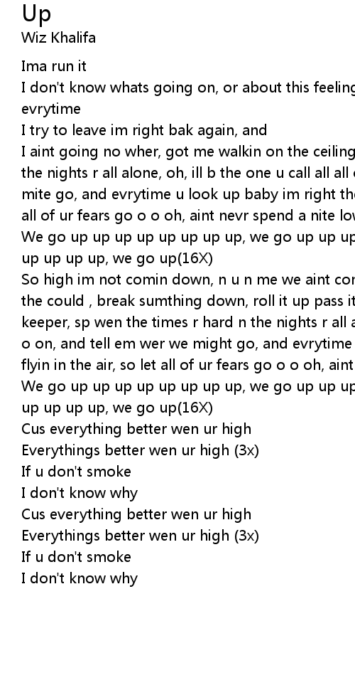 So high im not comin down, n u n me we aint comin either, lets write our names n the could , break sumthing down, roll it up pass it all around, got damn she a keeper, sp wen the times r hard n the nights r all alone, ill b the one u call o o on, and tell em wer we might go, and evrytime u look up bby im right ther, flyin in the air, so let all of ur fears go o o oh, aint nevr spend a nite low, |