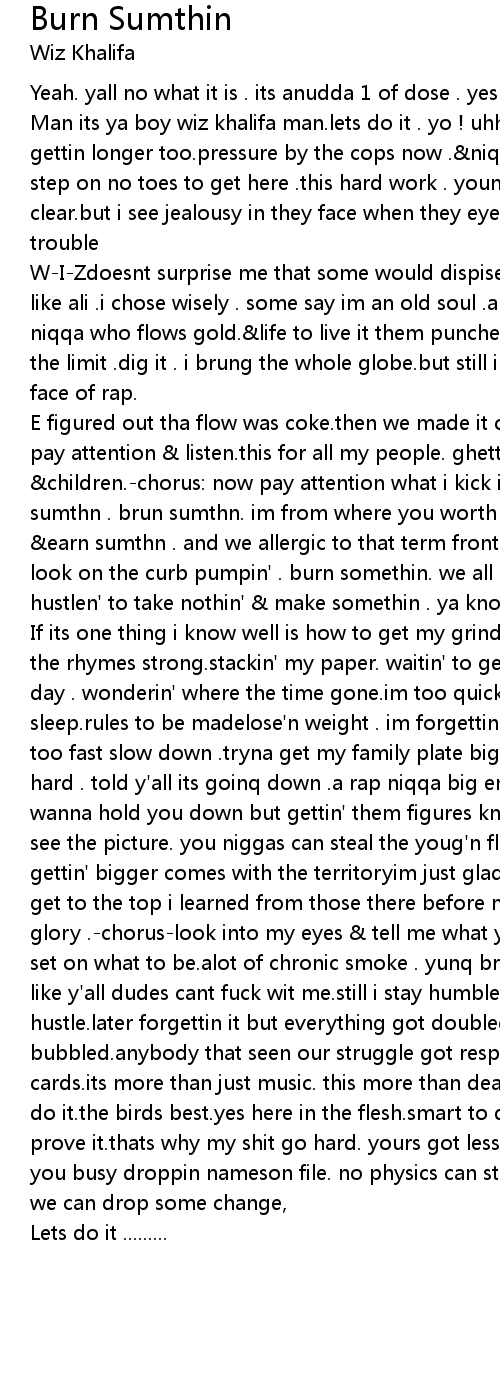 Man its ya boy wiz khalifa man.lets do it . yo ! uhhim kinda hot now money gettin longer too.pressure by the cops now .&niqqas haten on ya do .see i aint step on no toes to get here .this hard work . young'n gotta flow. the shit's clear.but i see jealousy in they face when they eye me.love the lames want'n to trouble |