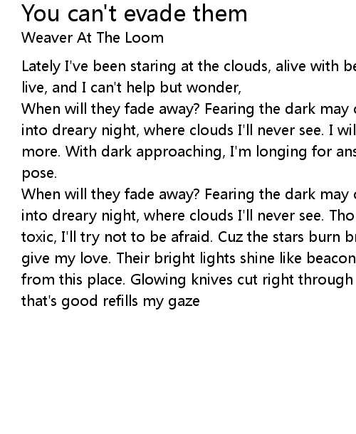 When will they fade away? Fearing the dark may come my way, turning day back into dreary night, where clouds I'll never see. I will stare 'til I can see no more. With dark approaching, I'm longing for answers to these questions that i pose. |