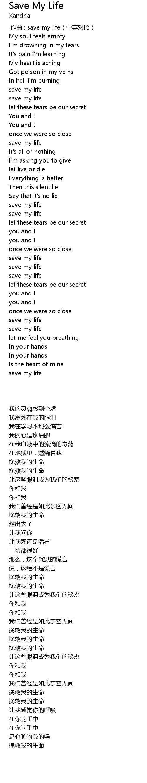 | [00:00.00] | 作曲 : save my life(中英对照) |