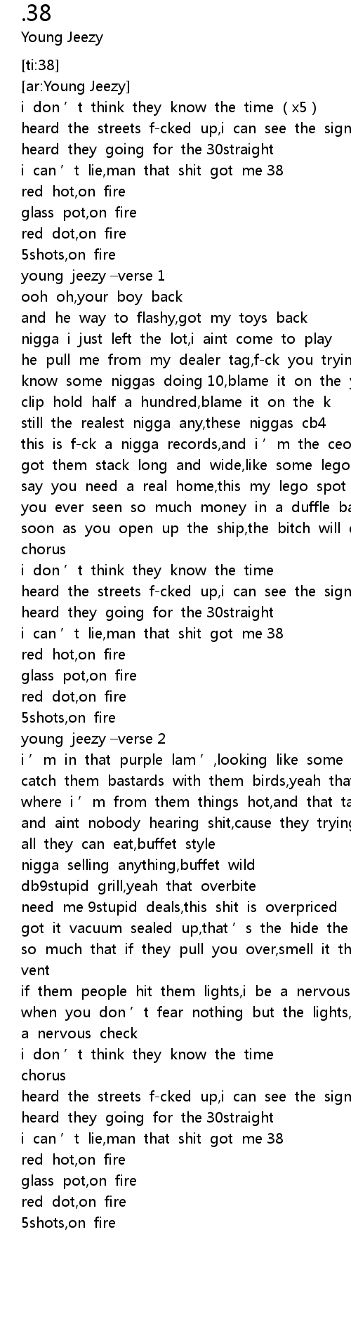 | [01:46.401] | i can ' t lie, man that shit got me 38 |