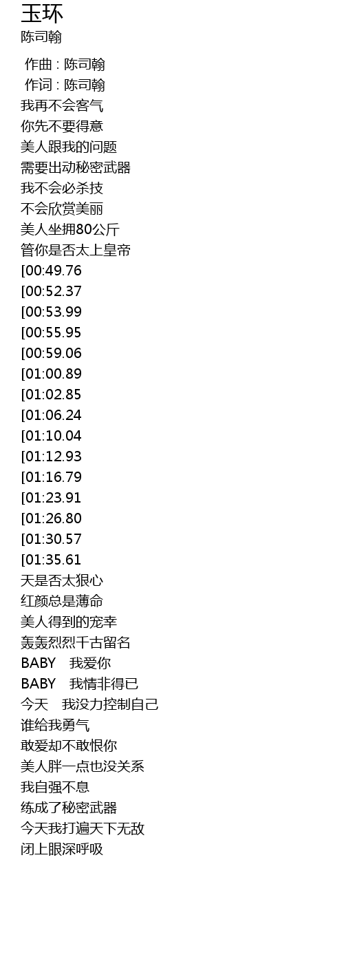 | [02:34.15][01:12.93] | BABY wǒ qíng fēi děi yǐ |