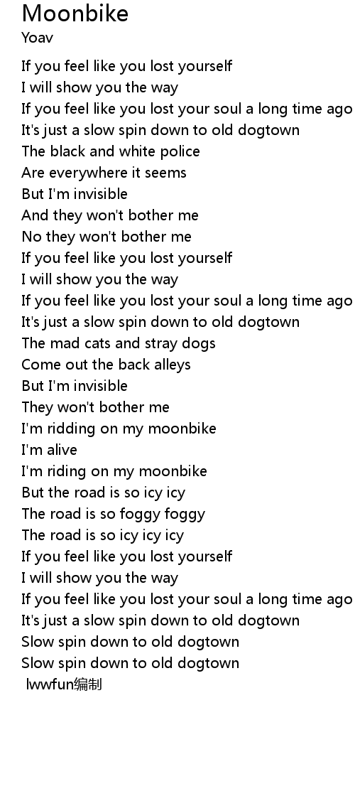 | [00:35.73] | It' s just a slow spin down to old dogtown |