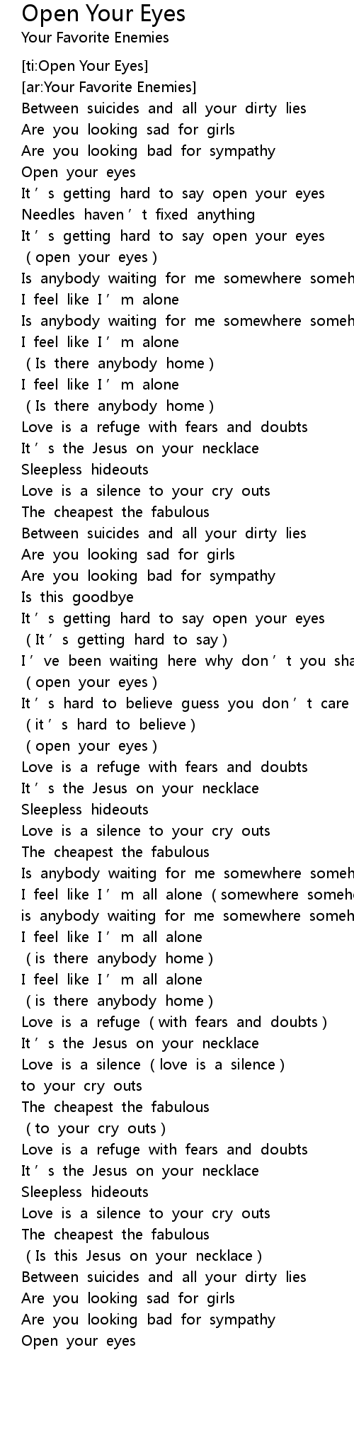 | [00:59.134] | It ' s getting hard to say open your eyes |