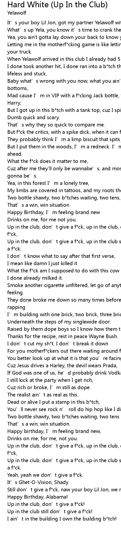 | [02:40.80] | Up in the club, don’t give a f*ck, up in the club still don’t give a f*ck. |