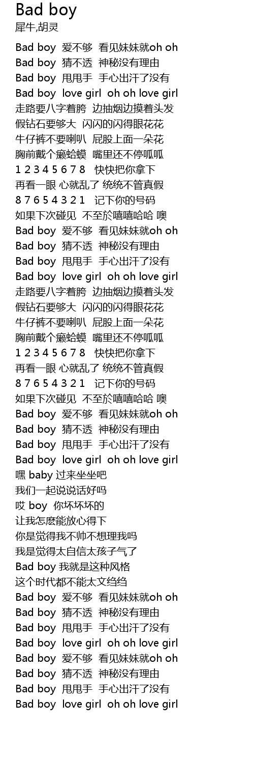 | [00:10.65] | Bad boy ai bu gou kan jian mei mei jiu oh oh |