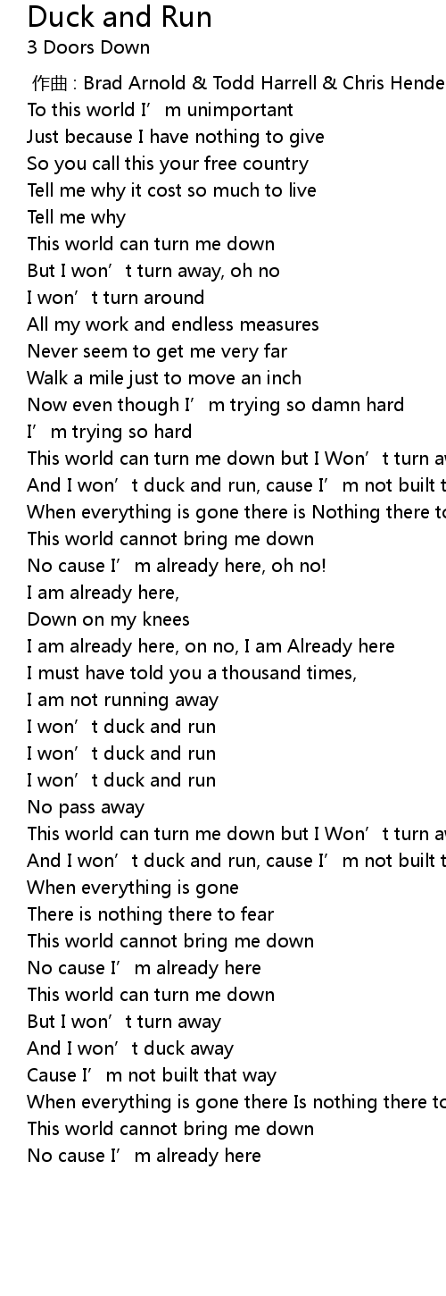 | [00:00.00] | 作曲 : Brad Arnold & Todd Harrell & Chris Henderson & Matt Roberts |