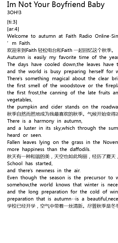 | [00:46.529] | Welcome to autumn at Faith Radio OnlineSimply to Relax, I ' m Faith. |