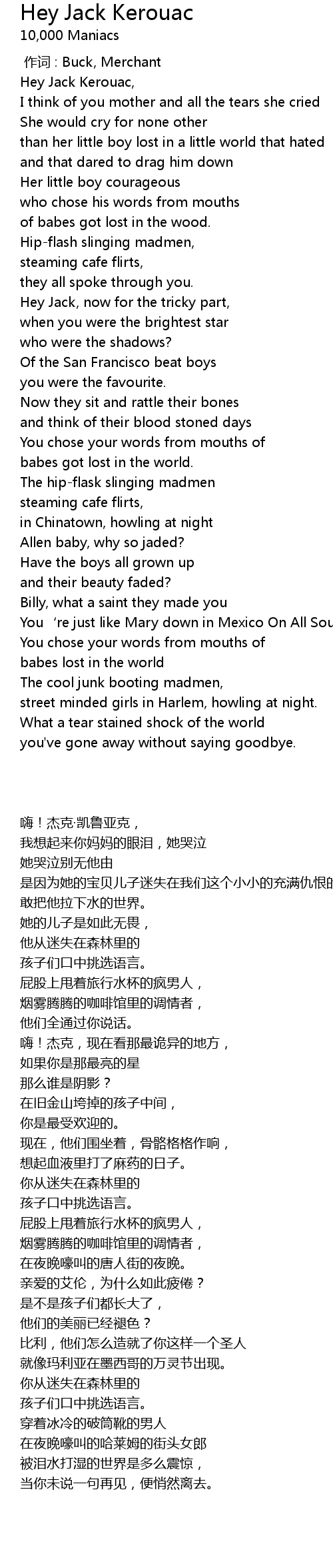 | [00:09.33] | Hey Jack Kerouac, |