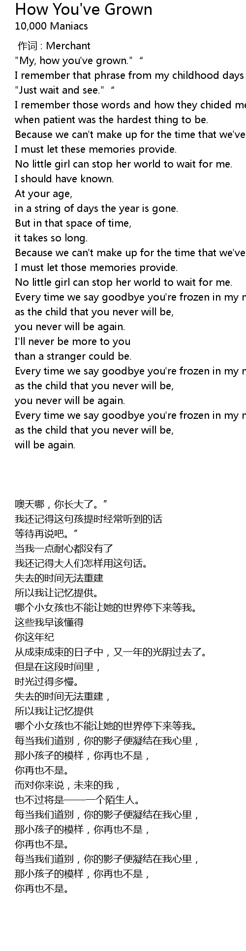 | [01:57.30] | No little girl can stop her world to wait for me. |