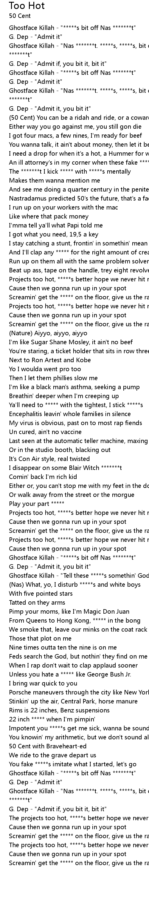Ghostface Killah - "Nas *******t. *****s, *****s, bit off, Nas *******t" |