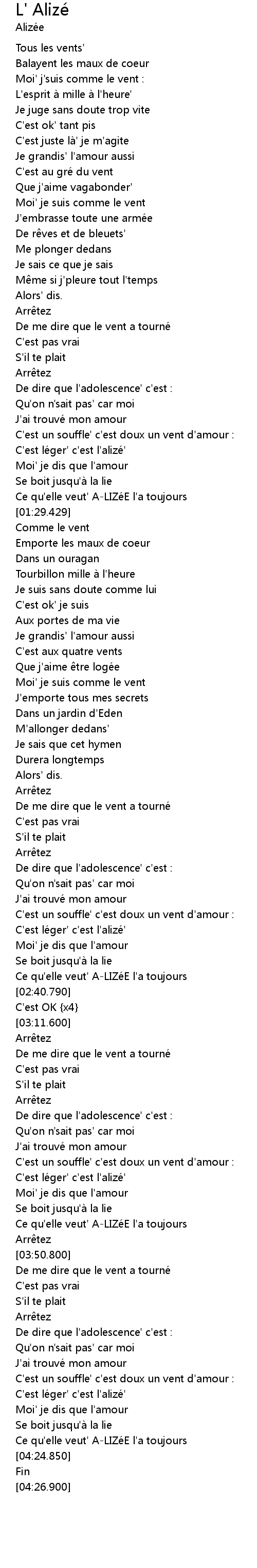 | [03:46.700] | Ce qu' elle veut' ALIZe E l' a toujours |