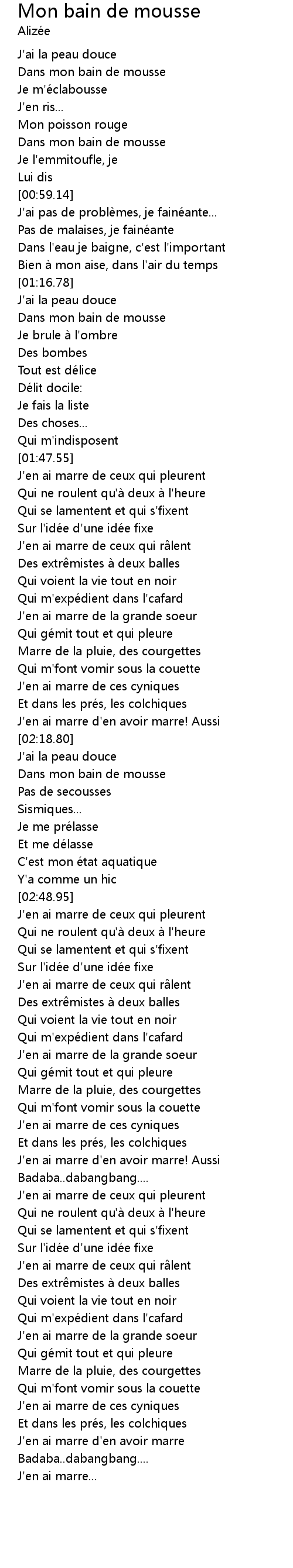 | [02:14.95] | J' en ai marre d' en avoir marre! Aussi |