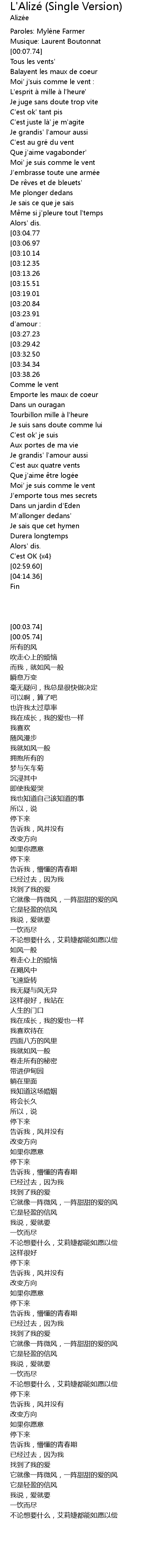 | [04:01.35][03:27.23][02:16.88][01:06.42] | C'est léger' c'est l'alizé' |