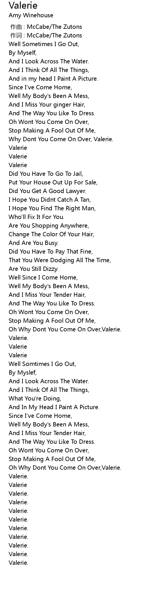 | [02:51.860] | Oh Why Dont You Come On Over,Valerie. |