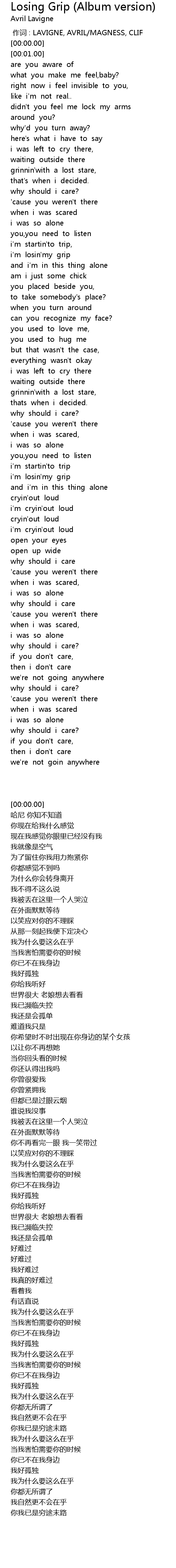 | [00:00.00] | zuo ci : LAVIGNE, AVRIL MAGNESS, CLIF |