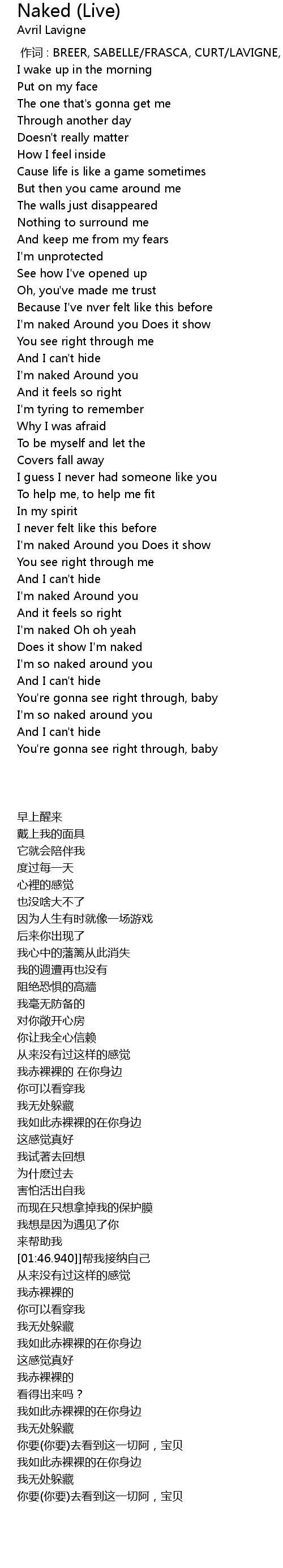 | [01:15.010] | I' m naked Around you |