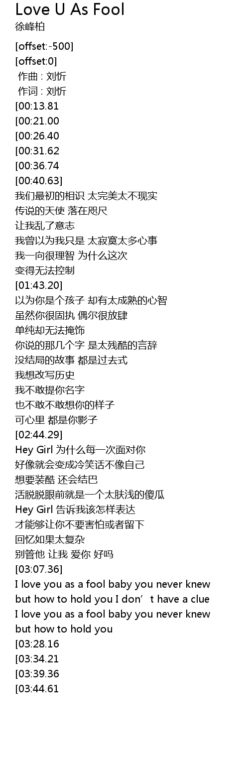 | [01:34.17][00:31.62] | I love you as a fool baby you never knew |