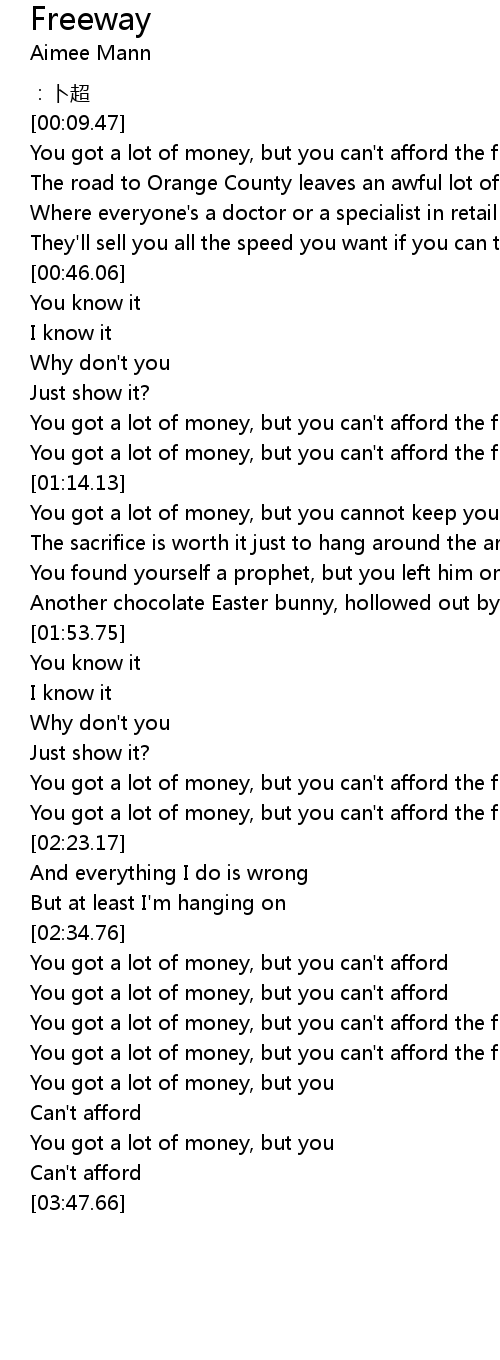 | [00:58.53] | You got a lot of money, but you can' t afford the freeway |