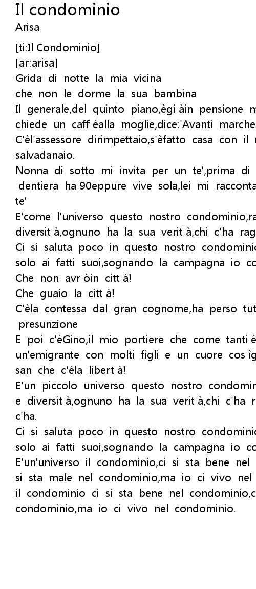 | [03:14.38] | E'un'universo il condominio,ci si sta bene nel condominio,ci si sta male nel condominio,ma io ci vivo nel condominio.E'un'universo il condominio ci si sta bene nel condominio,ci si sta male nel condominio,ma io ci vivo nel condominio. |