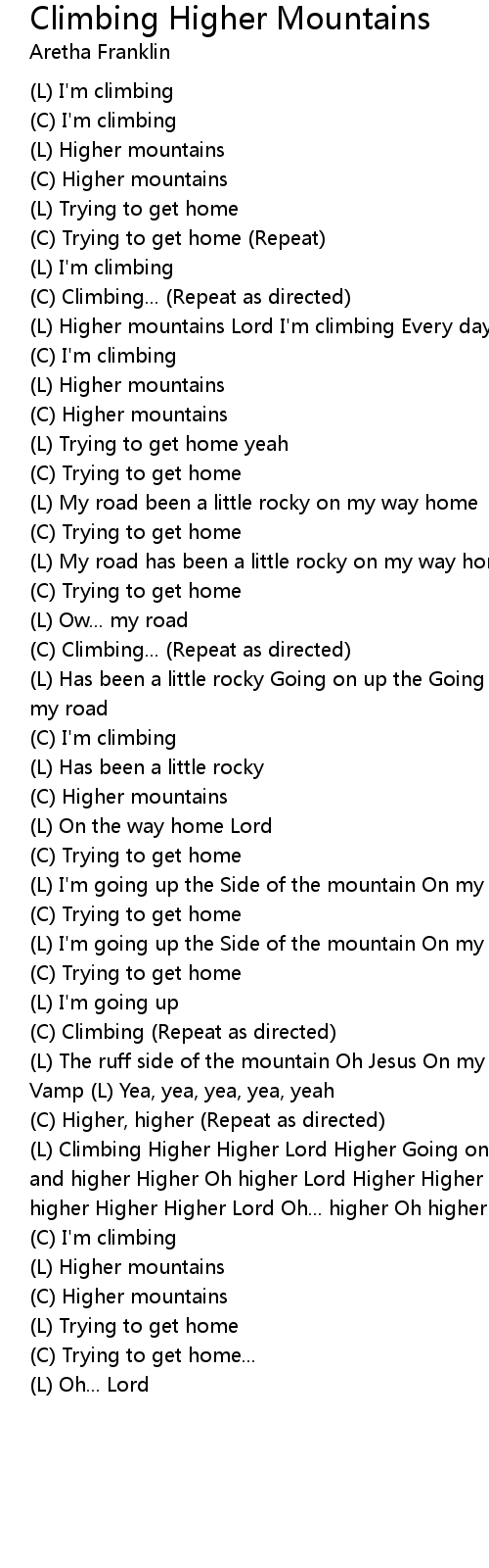 (L) Climbing Higher Higher Lord Higher Going on higher Lord To meet Jesus Higher and higher Higher Oh higher Lord Higher Higher Lord Higher Higher Oh... hey Yeah higher Higher Higher Lord Oh... higher Oh higher I'm climbing |