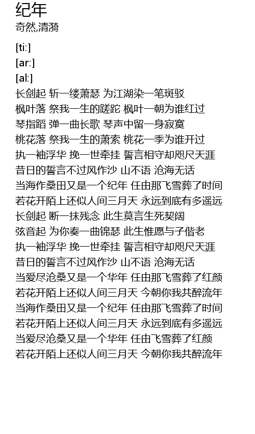 | [00:30.71] | 长剑起 斩一缕萧瑟 为江湖染一笔斑驳 |