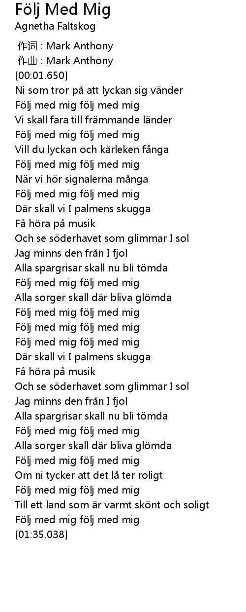 | [01:29.535] | Följ med mig följ med mig |