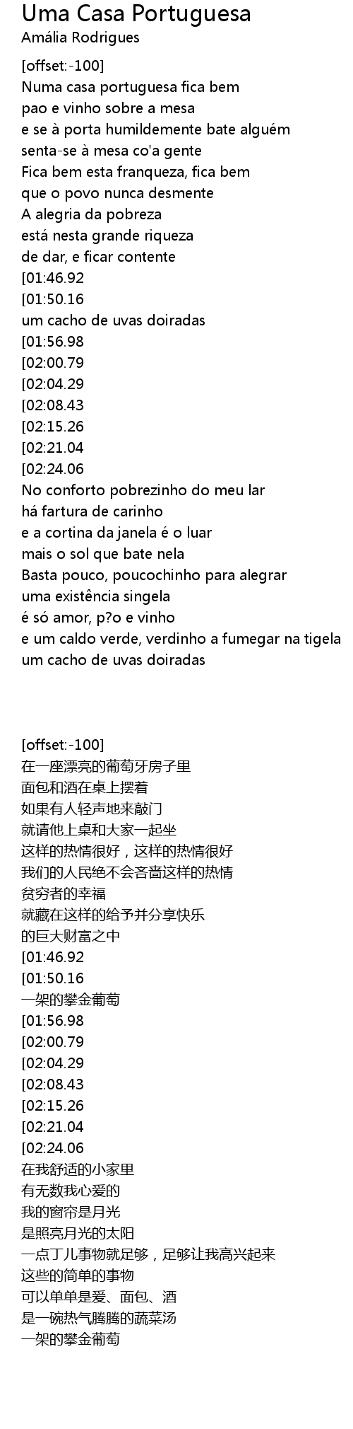 | [01:10.99][02:21.04][02:30.25] | é uma casa portuguesa, com certeza! |