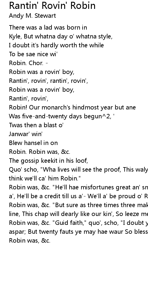 Robin was, &c. "Guid faith," quo', scho, "I doubt you gar The bonie lasses lie aspar; But twenty fauts ye may hae waur So blessins on thee! Robin." |
