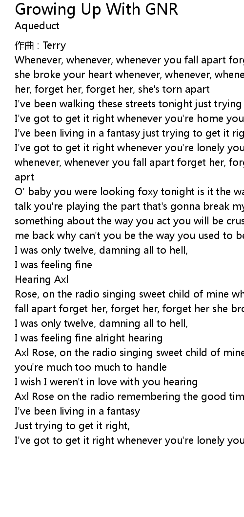 | Rose, on the radio singing sweet child of mine whenever, whenever, whenever you fall apart forget her, forget her, forget her she broke your heart | |