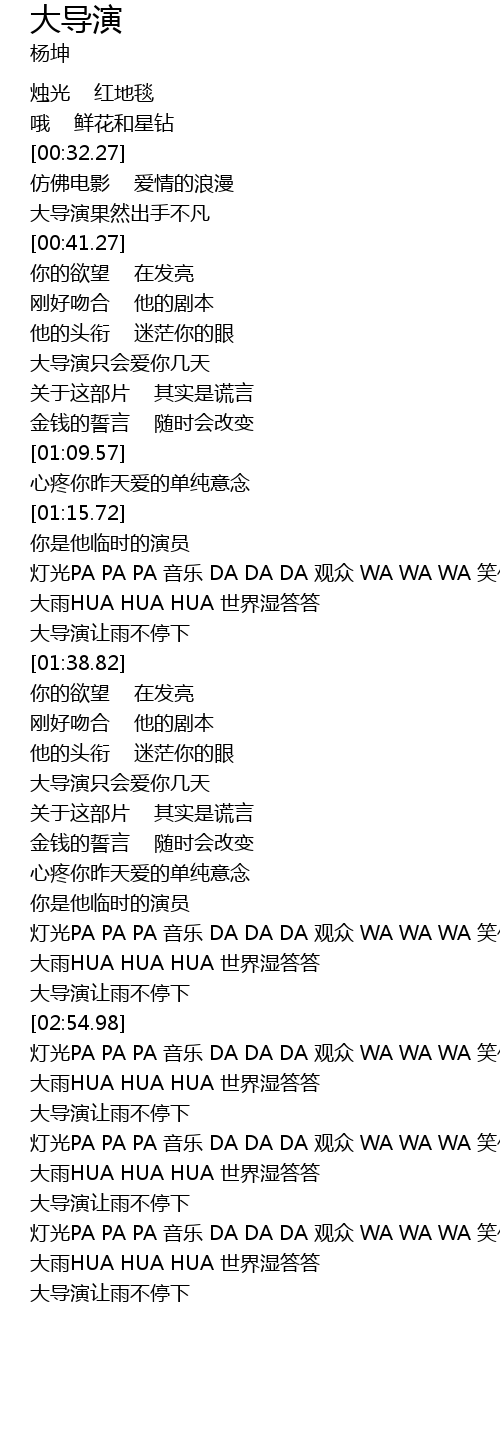 | [02:36.24] | dēng guāng PA PA PA yīn yuè DA DA DA guān zhòng WA WA WA xiào nǐ dà shǎ guā |