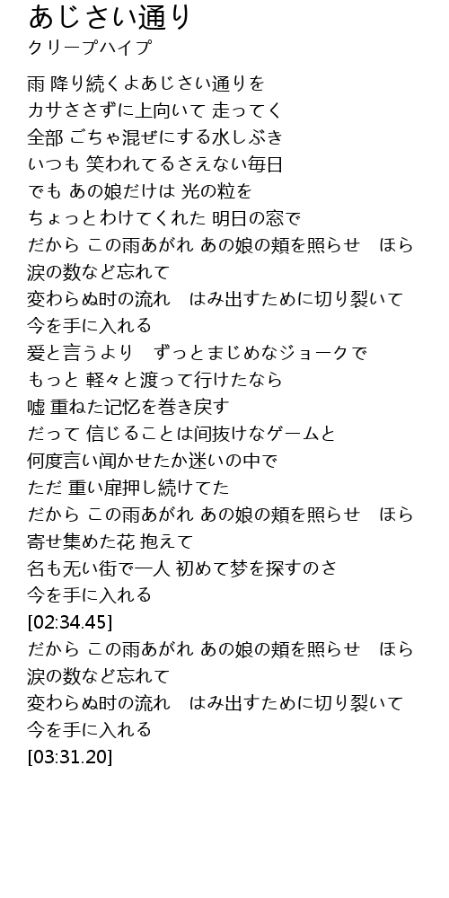 | [00:44.92] | だから この雨あがれ あの娘の頬を照らせ ほら |
