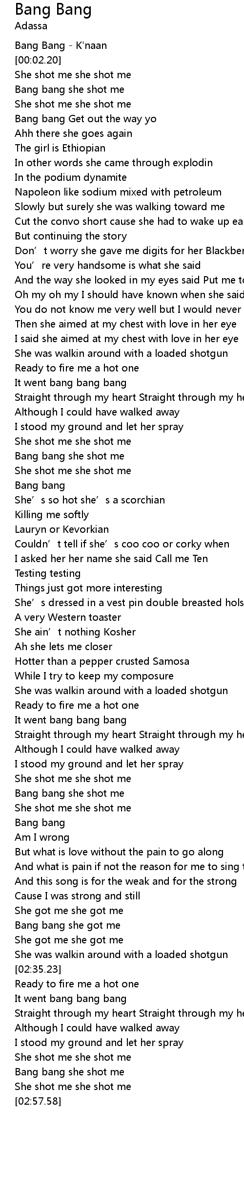 | [02:31.23] | Bang bang she got me |