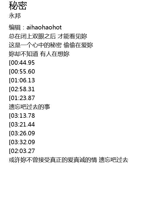 | [00:22.55] | 这是一个心中的秘密 偷偷在爱妳 |
