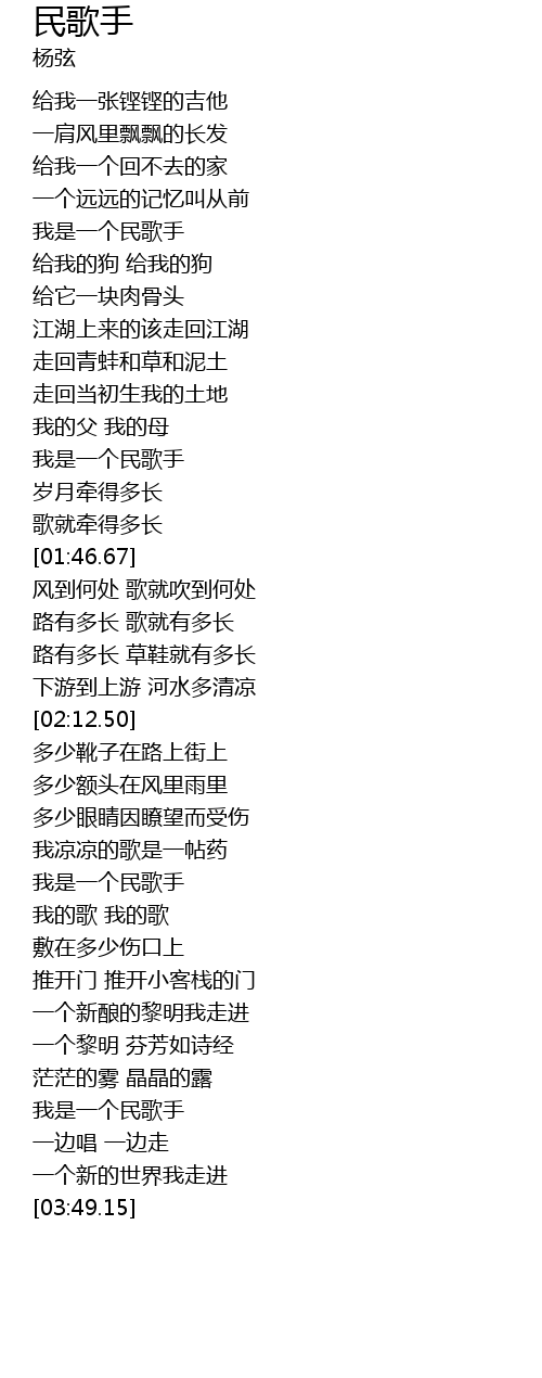 | [00:39.37] | wǒ shì yí gè mín gē shǒu |