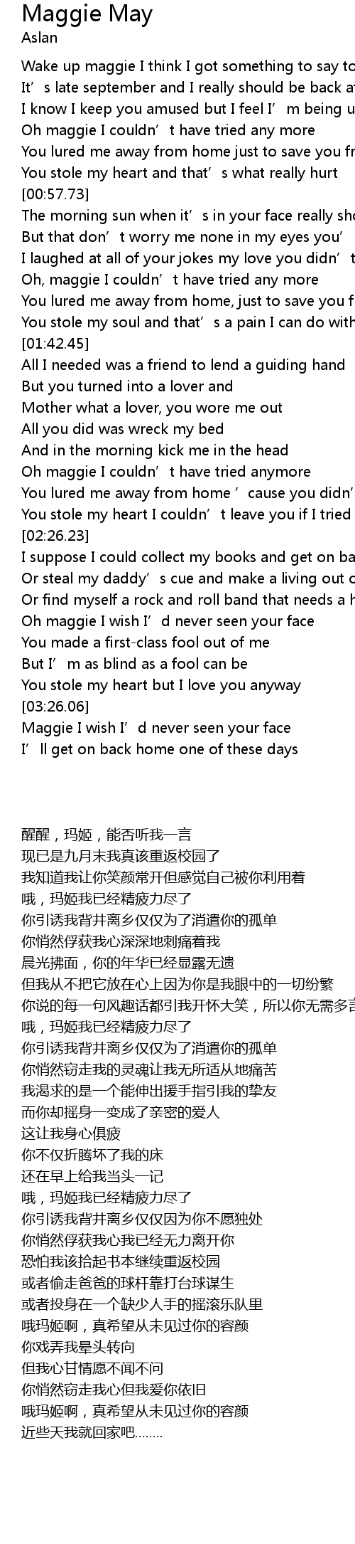 | [03:06.07] | Oh maggie I wish I' d never seen your face |